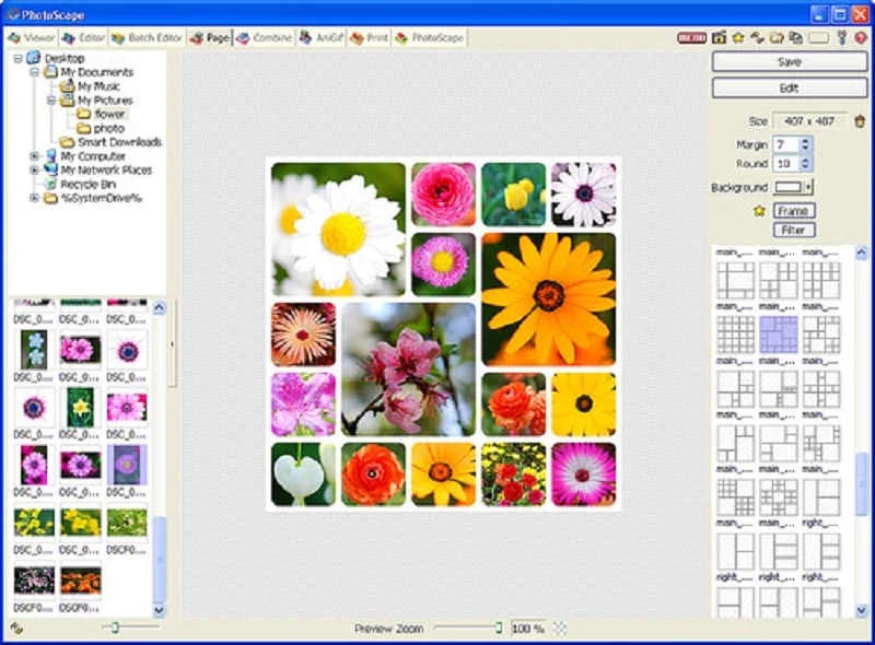 이 앱은 여러 장의 사진을 하나로 합치고 페이지 프레임 안에 정리할 수 있는 콜라주 탭도 제공합니다. 사진을 세로 또는 가로로 연결하여 멋진 파노라마 사진을 만들 수도 있습니다.